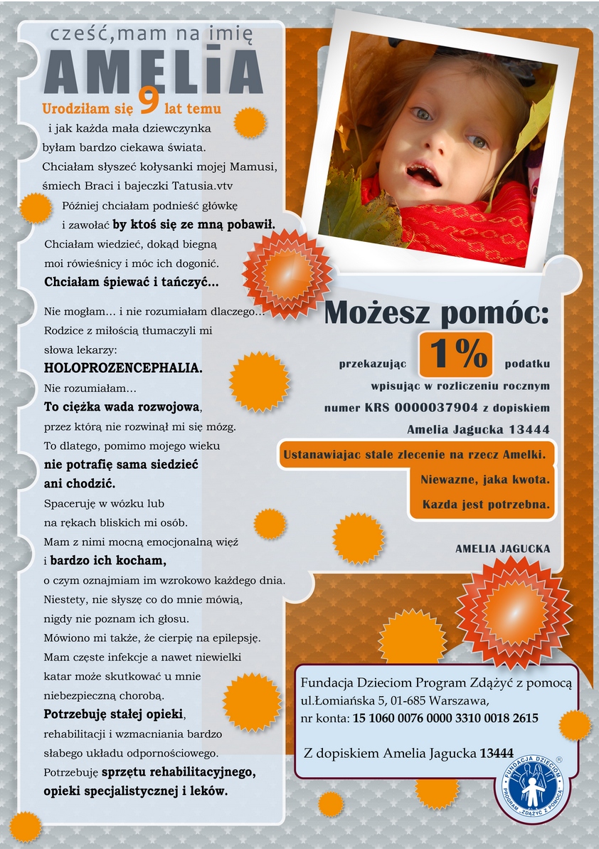 * przekazując 1 % podatku wpisując w rozliczeniu rocznym numer KRS 0000037904 i z dopiskiem Amelia Jagucka 13444