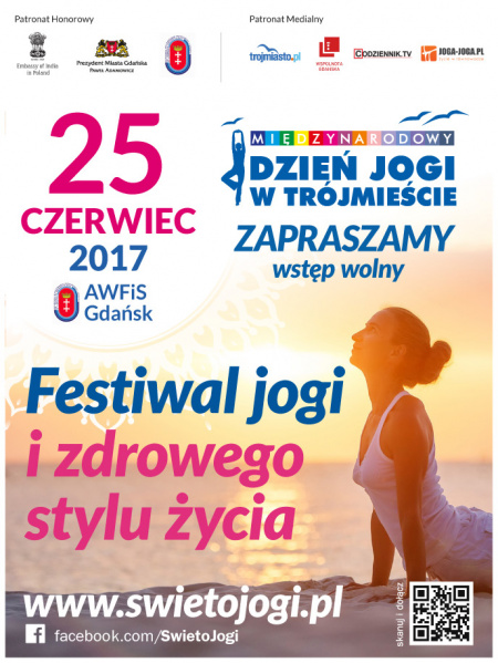 Międzynarodowy Dzień Jogi do Gdańska 25 czerwca 2017 r. Zapraszamy na teren Akademii Wychowania Fizycznego i Sportu na gdańskiej Żabiance, gdzie odbędzie się całodzienny festyn rodzinny poświęcony jodze i zdrowiu w godz .8.30 - 19.00.