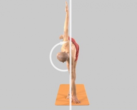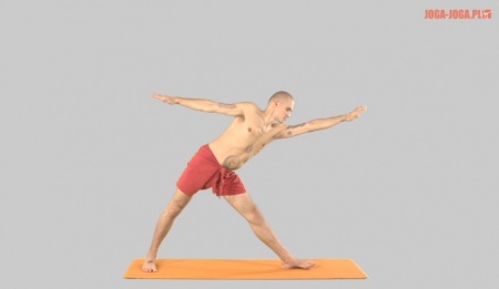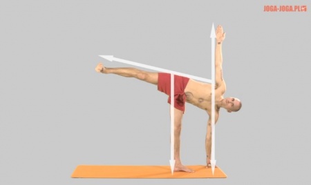 7. Od Twojej lewej pachy do Twojej lewej pięty - jedna linia. Prawa noga ustawiona prostopadle do podłogi, ręce w osi. Możesz skręcić głowę i spojrzeć do góry lub możesz mieć głowę w osi kręgosłupa. Skręt klatki piersiowej i płaszczyzna pozycji.