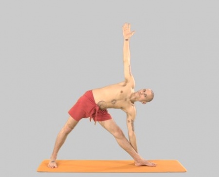 4. Wydech - wyciągając bok tułowia przejdź do Utthita trikonasany - rozpostarty trójkąt. Kilka spokojnych oddechów...