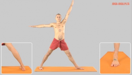 2. Skręć stopy tak jak do pozycji trójkąta rozpostartego - prawa noga 90 stopni na zewnątrz.