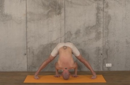 W tej chwili, pozycja jest podparta zarówno na stopach jak i czubek głowy i dłonie są na ziemi. Spokojne wdechy i wydechy.