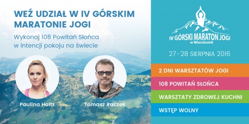 IV Górski Maraton Jogi w Wierchomli to 2-dniowe, otwarte warsztaty jogi (WSTĘP WOLNY) prowadzone przez: Radka Rychlika i Wiktora Morgulca. Ambasadorami imprezy są: Tomasz Raczek i Paulina Holtz.