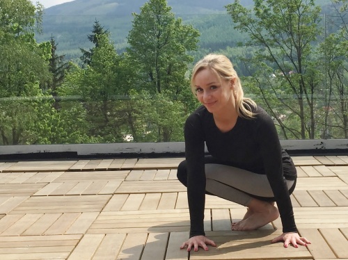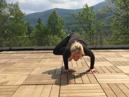 • Umieść teraz dłonie rozstawione na szerokość barków na podłożu. Uwaga! cała powierzchnia dłoni musi równomiernie przylegać do maty! Utrzymując napięte mięśnie w okolicach przepony, zacznij powoli przenosić ciężar ciała do przodu na ręce, patrząc cały czas przed siebie. (zdj.3)
