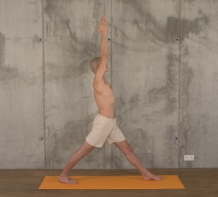 3. Skręć wnętrza dłoni do góry. Wyciągnij ręce w górę i przejdź śmiało do pozycji Wojownika I: