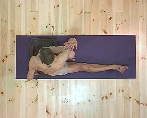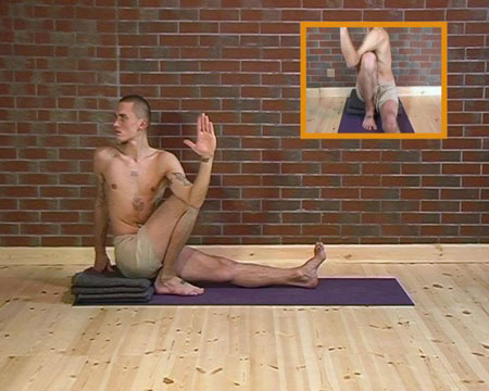 3. Dociśnij dobrze łokieć do kolana i prawą stopę do podłogi, tak, że prawy piszczel nie ugina się pod naporem łokcia - stawia opór.