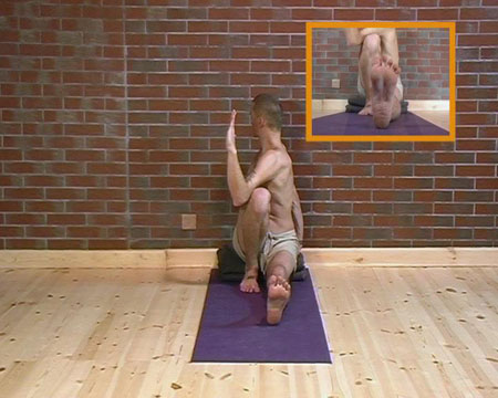 2. Bardzo aktywna, wyprostowana prawa noga, prawa pięta dociśnięta do podłogi. Palce prawej stopy do sufitu, rzepka kolanowa podciągnięta do góry.
