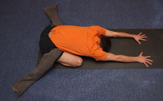 ** można też zrobić na krześle; siedzenie okrakiem, koc w pachwinach, skłon do przodu.