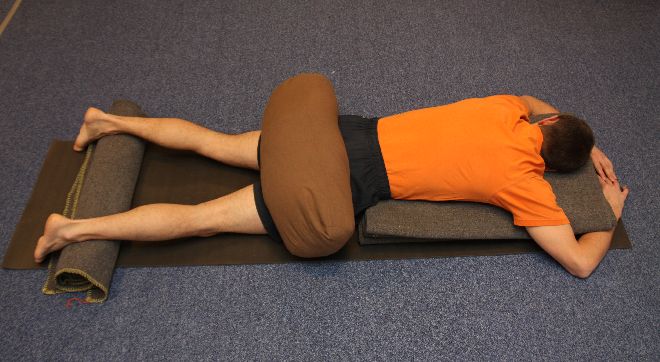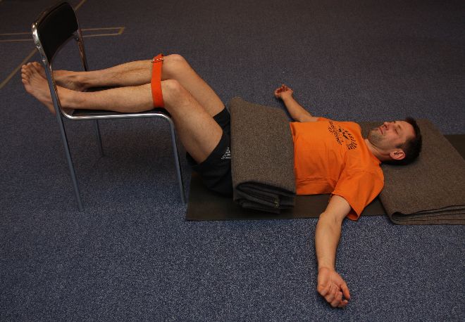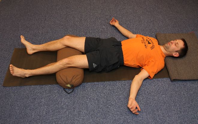 a. Leżenie w śavasanie z podpartymi kolanami,