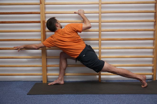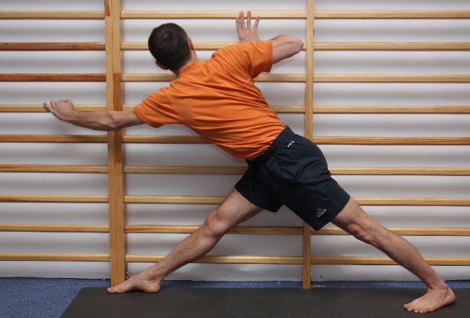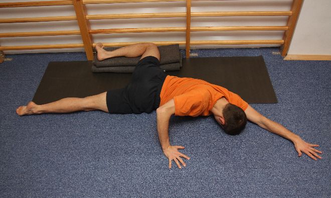14. Leżenie na brzuchu noga zgięta do kąta 90, stopa i kolano podparte na kocach do wysokości biodra, dodatkowo stopa i kolano opierają się o ścianę - tułów wyciągamy w przeciwnym do ściany kierunku.
