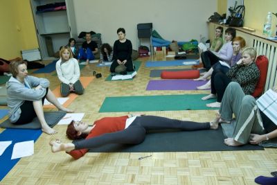 Przed przerwą przećwiczyliśmy także krótki, 20-minutowy zestaw asan i vinyas, będący profilaktyką problemów z kolanami.Druga część zajęć dotyczyła problemów ze stawem biodrowo-udowym. Budowa tego stawu jest na tyle skomplikowana, że warto sięgnąć do anatomii opisowej lub atlasu. Jego prawidłowe funkcjonowanie jest niezwykle istotne praktycznie dla całego ciała, a zwłaszcza dla pracy kolan i kręgosłupa. Przeanalizowaliśmy i wykonaliśmy pozycje szczególnie przydatne w pracy z biodrami: siad skrzyżny i jego warianty, gomukhasana II, baddhakonasana, siad płotkarski, purnautkatasana, malasana, upavistakonasana, dvi pada pitham (ćatuśpadasana).