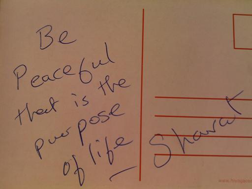 …napisał mi Sharat Arora na widokówce, którą otrzymaliśmy od niego na zakończenie pięciodniowego kursu dla początkujących. Wzięłam udział (wraz z pięćdziesięcioma innymi osobami) w warsztacie Sharata w jego szkole Himalayan Yoga Centre na Goa.