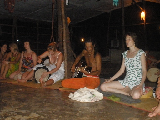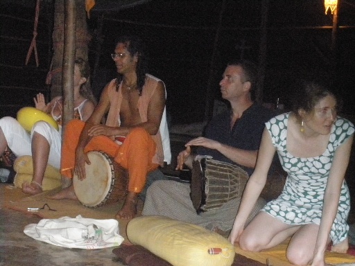 Sharat na koniec warsztatu zaprasza nas na wieczorne spotkanie przy herbacie i muzyce (miały być jeszcze ciastka, które mieliśmy my przynieść, ale jakoś nie wyszło :) co oczywiście nie umyka uwadze Mistrza). Sharat gra na bębnach, gitarze i jakimś instrumencie, którego nazwy nie pamiętam. Proponuje również poranną wycieczkę w góry, która będąc codziennym spacerem z jego psem jest dla uczestników wyjazdu jednym z ciekawszych przeżyć. To takie pozajogowe (choć jak podkreśla Sharat bardzo ) elementy, o które zadbał. Dostaliśmy też prezenty: pocztówki / ściągi do praktyki oraz woreczki z piaskiem z plaży do przykrycia i relaksowania oczu.