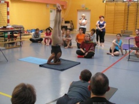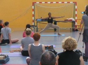 Ciekawe było to, co Jaki mówiła o proporcjach ciała (długie nogi, krótki tułów lub odwrotnie). Pokazała jak efektywniej pracować, jeżeli nie jesteśmy proporcjonalni, wykorzystując do tego pomoce. Dobrym pomysłem, były też pokazy na szkielecie człowieka. Natomiast w moim przypadku nie sprawdzają się techniki ustawiana ramion w asanach, oraz bardzo dużych rozkroków w pozycjach stojących, które proponowała Jaki. jest sposobem ustawiania wszystkich elementów w pozycji na zasadzie równowagi (pogodzenia), a nie walką o zrobienie pozycji. Technicznie chodzi o np. to, że przy zbyt dużym dystansie w pozycjach stojących muszę walczyć o ustawienie stóp, bioder, tułowia itd. Wolę wywołać określoną pracę w pozycji, kiedy dystans jest mniejszy i łatwiej to wszystko zrobić. Później mogę zwiększać dystans, dzięki temu moja praca jest ekonomiczna. Nie lubię wkładać nadmiernego wysiłku w to, co robię. To tak jak z jazdą samochodem: najpierw trzeba ruszyć i rozpędzić się stopniowo, żeby nie spalić niepotrzebnie zbyt dużo paliwa, lub kiedy idę na spotkanie wolę wyjść wcześniej i zdążyć spokojnie na czas, a nie pędzić na ostatnią chwilę. Zdziwiło mnie też to, że w wielu przypadkach Jaki rezygnowała z użycia pomocy, których było naprawdę dużo (podziękowania dla organizatorów). Nie jestem zwolennikiem używania pomocy bez potrzeby, ale na sali były osoby, którym umożliwiłyby one poprawne wykonanie pozycji np. w skłonach do przodu pasek lub siedzenie wyżej.