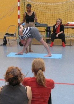 Powiem krótko -warsztat podobał mi się.Jaki jako nauczycielka zrobiła na mnie wrażenie swoim podejściem. Wiem, z rozmowy z nią podczas przerwy, że wcześniej planowała użycie ścian i że to na bieżąco zmieniła. Była cały czas z całą grupą poza kilkoma momentami, kiedy zajęła się osobami pod ścianą podczas wykonywania pozycji odwróconych.