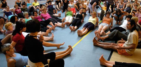 A cały warsztat opierał się na kilku prostych założeniach: wszyscy uczestnicy są początkujący (wyobraźcie sobie, że niczego nie wiecie o jodze); w pracy skupiamy się na fundamentach - pracy stóp i dłoni (nie szukamy żadnych lokalnych ruchów, np. przez trzy dni ani raz nie usłyszeliśmy "mantry nr 1": podciągnijcie rzepki kolan); asana składa się z pracy nad fundamentem i szukania spokoju w całej reszcie ciała (zwłaszcza w głowie); wreszcie - daj ciału szansę w czasie (zamiast kilku powtórzeń, stosunkowo długie czasy trwania w pozycji). Wszystko to sprawiło, że umysł nie był absorbowany ogarnięciem wielu przeciwruchów (samo ustawianie nóg w tadasanie!), mogliśmy więc spokojniej pracować w każdej asanie (im spokojniej, tym mniej wysiłku ona sprawia). I jeszcze jedno - unikanie dogmatów. Szalenie trudno jest dobrze ustawić ciało w tadasanie ze stopami połączonymi, ale jeśli rozstawimy nogi na szerokość długości jednej stopy, wszystko staje się prostsze.
