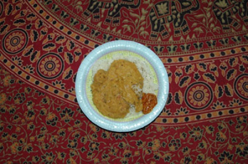 Po gorących owacjach, zaczęła się kulinarna część imprezy. Podano tradycyjnie przyprawione potrawy indyjskie- ryż z gorczycą, zupkę z soczewicy, odrobinę piekielnie ostrych "mango pickle" oraz czaj aromatyczną herbatkę - z dodatkiem kardamonu.