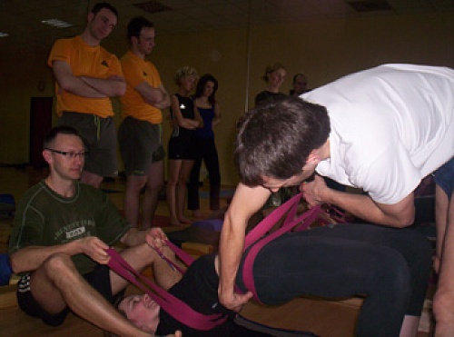 Pierwsza sesja była prowadzona precyzyjnie, z dużą uważnością. widać było jak świadomy nauczyciel "bada" swoich studentów. Po południu, znając już możliwości uczniów, można było pójść o krok dalej. Jednak i na tej sesji, osoby, które nie czuły się na siłach, by wkroczyć w mocniejszą pracę, otrzymywały inny zestaw pozycji, stanowiący wystarczające wyzwanie. Wszyscy zatem mogli praktykować z zaangażowaniem i z radością.