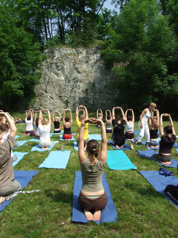 Pracowaliśmy w pozycjach jogi ustawiwszy się w mandali, było to nowe, integrujące grupę oraz inspirujące do lepszej praktyki działanie. Sesja zwieńczona została pranayamą.
