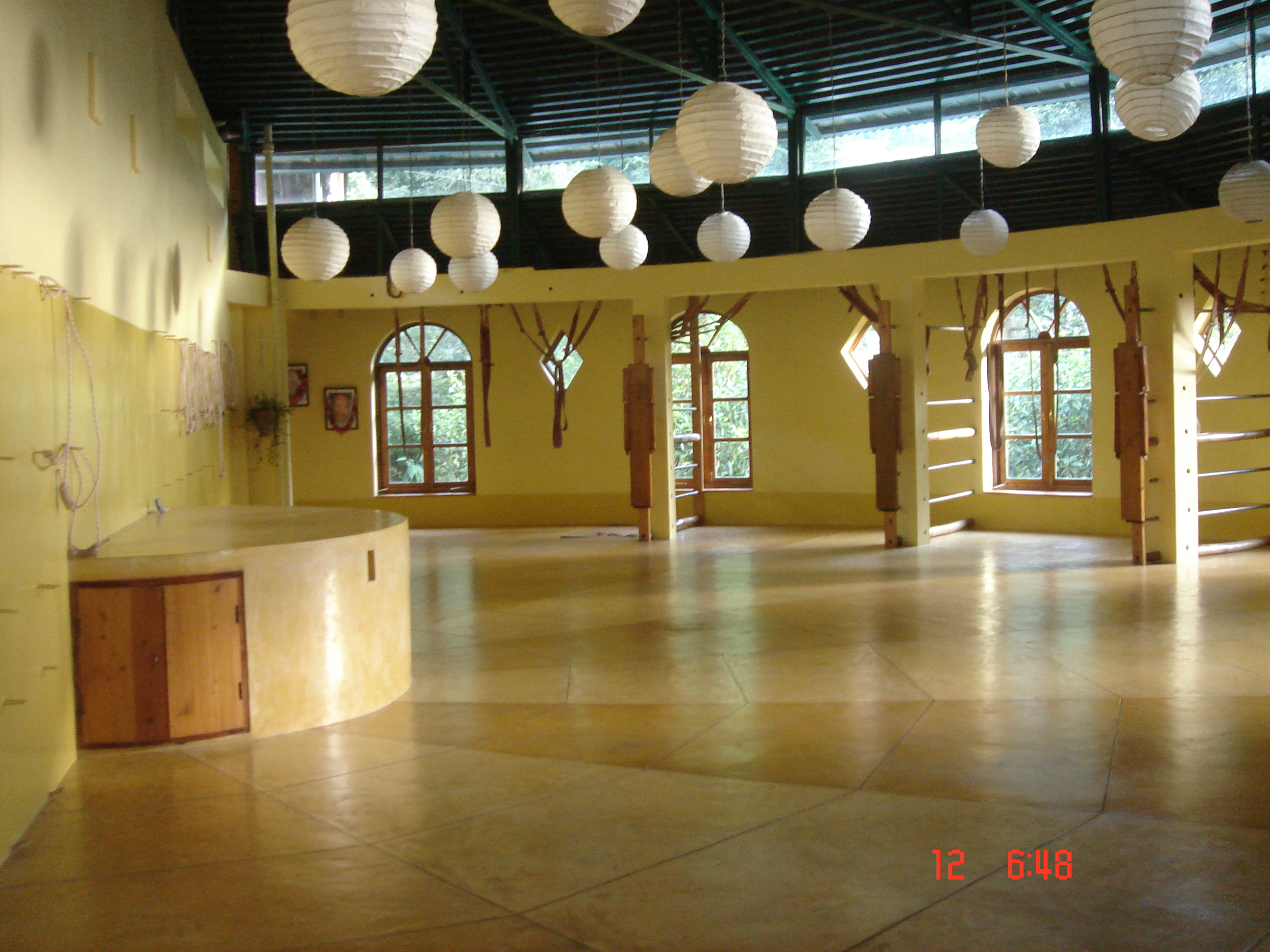 W sali podłoga to zwykły beton, równo wylany i pomalowany farba zbliżoną kolorem do barwy ścian. Światło wpada przez liczne, ale niezbyt duże okna. W świetle tym przegląda się zieleń porastająca teren wokół budynku. W projekcie wnętrz budynku widać glebie przemyśleń użytkownika. Wszystko znajduje swoje miejsce.