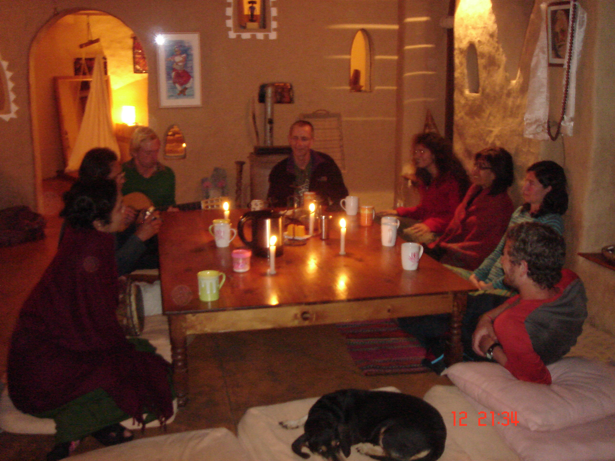 Julien przyniósł z drugiego pokoju gitarę Sharata. Zaczynamy muzykowanie. Marina z Izraela śpiewa pięknym, głębokim głosem, własne piosenki. Julien gra i śpiewa też własne utwory. Sharat na tablach wspomaga oboje.