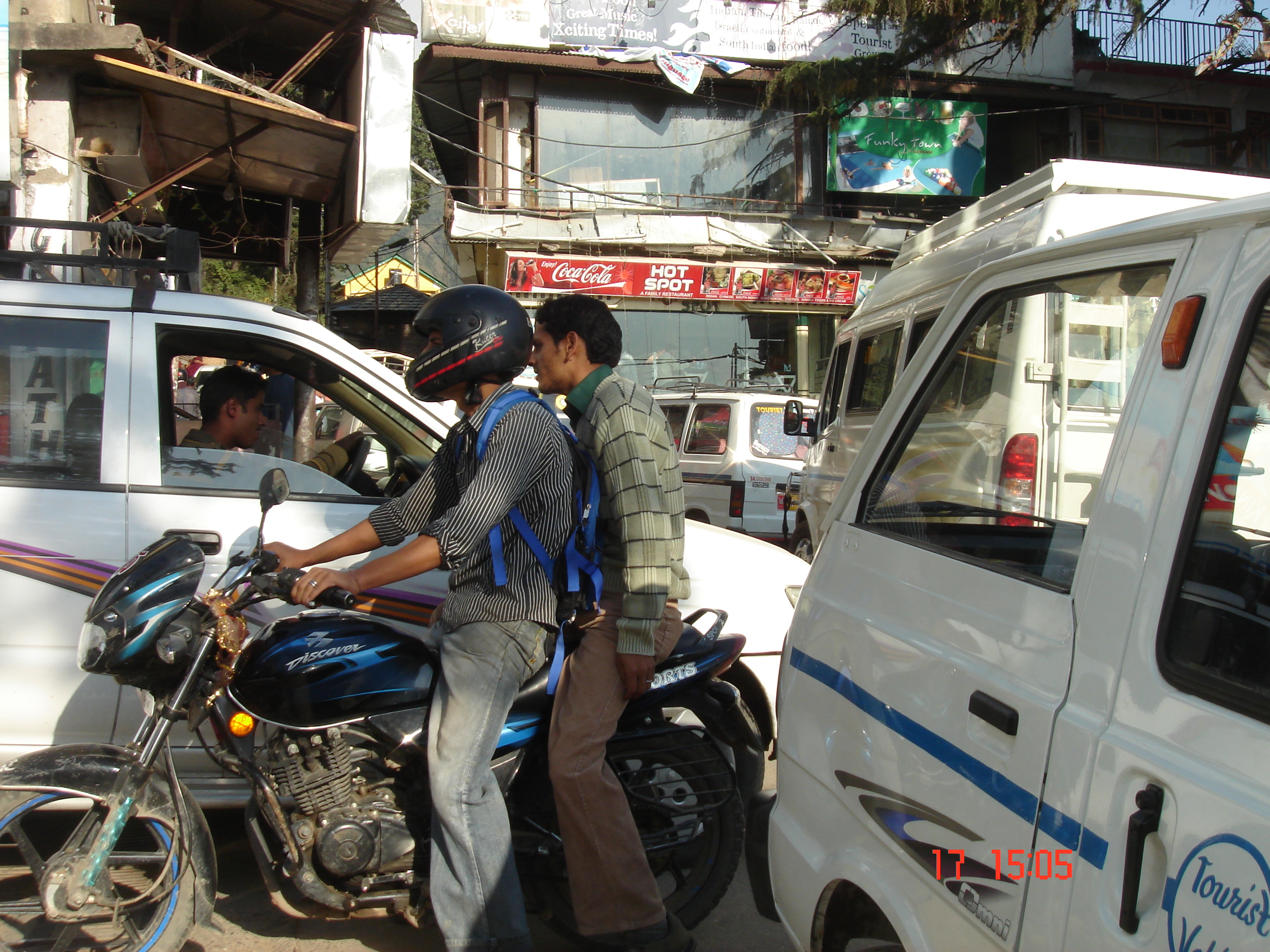 Rzecz bardzo ciekawa. Zauważyłam to jużw Delhi zaraz po przyjeźdie. Tu ma się podobnie. Mężczyzna, w kasku, prowadzi motor. Za nim siedzi bokiem, kobieta. Często pomiędzy nimi dziecko. Zdarza się, że drugie mężczyzna trzyma przed sobą. Wszyscy oni - kobieta i dzieci bez kasków!!!............ Może niepotrzebnie pobudzam swa wyobraźnię?