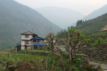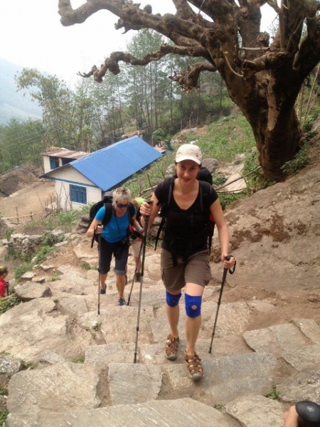 Poprzednia grupa, która była w Nepalu na jesieni i wędrowała po schodach w dół roztoczyła przerażającą perspektywę. Ruszamy rano, pogoda nam dopisuje, jest trochę pochmurnie, słońce schowane. Schody okazują się mniej straszne niż zapowiadany pogrom. Grupa porusza się sprawnie, idziemy rozstrzeleni na ładnych kilkuset metrach. Kilku dodatkowych porterów niesie naszym dziewczynom plecaki. Podejście w słońcu mogłoby być rzeczywiście męczące.