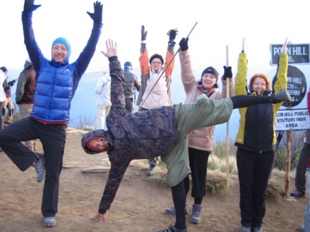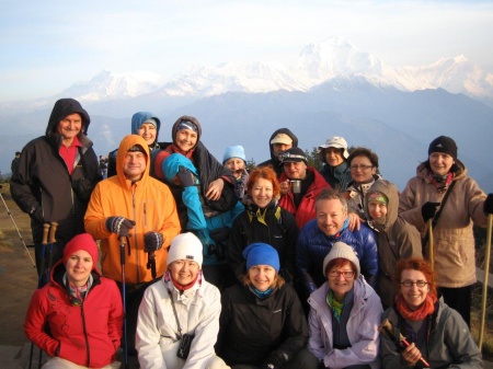 Jest ciemno i rzeczywiście chłodno około zera. Wyruszamy gęsiego, sznureczek światełek czołówek ciągnie się w dół. Mijamy naszych wcześniej napotkanych ziomków, potem Koreańczyków spotykanych na szlaku. Po chwili budka biletowa. Jest 5.00 rano, kupujemy po 25 Rp bilety wstępu na szczyt. Poon Hill to taki tutejszy Giewont, tyle, że wygląda jak Kopa Kondracka, wejście bez porównania prostsze. Zamiast kosówki rododendrony. Na szczycie stoi zamiast krzyża metalowa wieżyczka i budka z ciepłą herbatą. Jest około 5.30, słońce powoli wschodzi. Zimno, dobra widoczność po kilku chwilach szczyt zapełnia się ludźmi - lekko licząc z 200-300 osób, mieszanka z całego świata. Widok imponujący. Wypijamy kubek czaju, gruppen foto i na śniadanie. Na dole z tarasu naszej lodży widok też znakomity. Jemy śniadanie na zewnątrz z widokiem na Annapurnę i Daulaghiri dwa 8000 giganty.