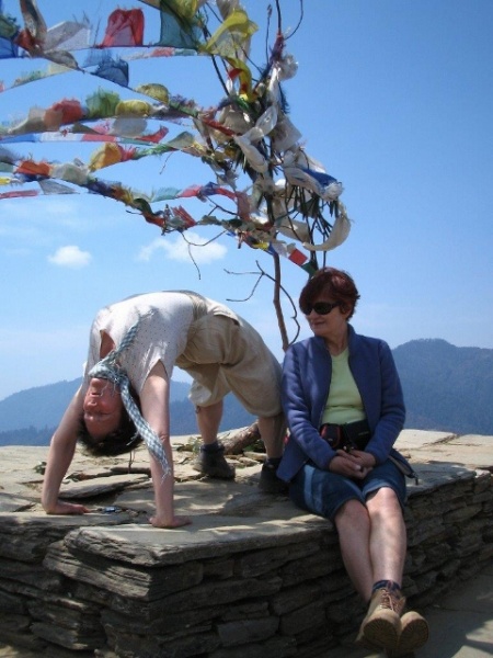 Gorący prysznic i w drogę. Mamy do przejścia kawałek w górę na 3200, potem w dół na 2600, gdzie mamy spać. Wygląda niewinnie- wg naszych Nepalczyków to 2h w górę, 3h w dół. Wyruszamy. Pod koniec podejścia na 3200 wychodzimy na grań, chcę założyć okulary i .... orientuję się, że zostawiłem pod prysznicem torebkę z okularami i aparatem. Zostawiam Humowi plecak i na lekko zbiegam w dół do wioski. Szybka wbitka, dostaję torebkę i hajda pod górę znowu 3200. Doganiam naszą tylną straż na grani. Widoki przepiękne, idziemy lekko falującym grzbietem wśród kwitnących rododendronów.W końcu docieram do rdzenia grupy odpoczywającego przy pięknie ułożonym kopcu kamieni, przyozdobionym tybetańskimi flagami. Robimy yoga - photo - session na kopcu. Każdy wybiera sobie jakąś asanę, w tle powiewające tybetańskie flagi. Bank rozbija Iwonka robiąc z marszu, ślizgiem w butach pełną Hanumasanę. Droga piękna wiedzie grzbietem wzgórz w cieniu rododendronów. Potem mocno w dół, zaczynają się problemy z kolanami, rozdaję 3 bandaże elastyczne, które mam w apteczce, kilka osób ma swoje. Kolana przy schodzeniu to najsłabsze ogniwo. Zaczyna kropić delikatnie deszcz. Ostatni odcinek nieoczekiwanie jest dość stromo pod górę. Docieramy do Tadapani 2600 - nasz nocleg. Jest chłodno i deszczyk kropi coraz bardziej, grupa schodzi się powoli. Ludziska są zmęczeni, ostatnia osoba wchodzi pod dach i zaczyna lać. Dla części grupy był to duży wysiłek.