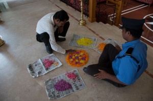 Przy wejściu do świątyni leży piękny kwietny Kriszna, przygotowany specjalnie z okazji Onam. W sobotę pierwszy z czterech dni Onam, choć faktycznie obchody zaczęły się sześć dni temu. Nie łatwo to zrozumieć, jak całe Indie zresztą…