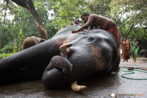 Odwiedziłem dziś świątynię Punnathur Kotta. Tutaj przetrzymywane są słonie, które wierni składają w ofierze świątyni w Guruvayur. Jest ich tu 65, przywiązanych łańcuchami do betonowych pali. Nie jest to widok, który mnie zachwycił. Słonie mają ograniczone możliwości ruchu i nerwowo kiwają się widząc przechodzących obok nich gapiów. Darowanie słonia świątyni uznawane było i jak widać w Kerali nadal jest za prestiżowy gest, na który stać tylko zamożnych. Część z nich pełni służbę świątynną i jest wykorzystywana w czasie codziennych procesji w obrębie świątyni. Niektóre stały się znane i opowiada się o nich historie, opisując ich charakter i zdarzenia, w których uczestniczyły. Większość jednak nie ma żadnych zadań i po prostu stoi tutaj, będąc atrakcją dla odwiedzających.
