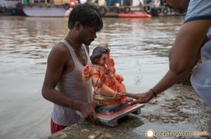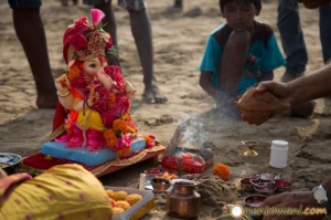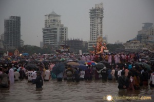 Już od rana przy wielu plażach Bombaju pojawiają się rodziny i grupy znajomych, którzy przyjeżdżają z figurkami Ganeśi i po spełnieniu modlitw albo sami wprowadzają wyobrażenia bóstwa do wody, albo cedują tę czynność na specjalnie powołany do tego personel, dysponujący pontonami, mieszczącymi po kilkanaście posążków. Najważniejszym miejscem, gdzie dokonuje się obrzędu jest plaża Chowpatty. Przyjeżdża tu samochód za samochodem, czasami taksówka, czasami truck a innym razem ciężarówka, przywożąc posągi i towarzyszące im rodziny, zawsze przejęte i w odświętnym nastroju. Także przy Bramie Indii, największym symbolu Bombaju, dokonuje się zanurzenia, co jest nieco bardziej skomplikowane, gdyż nie ma tu plaży i tylko dzięki dorabiającym sobie chłopakom, czującym się w wodzie jak ryby, możliwe jest odholowanie figur na bezpieczną odległość od brzegu. Do tego właśnie miejsca dotarłem z zaprzyjaźnioną rodziną Suresha, żegnając na cały rok Ganeśę. Nie jest to pożegnanie całkowite. Zawsze zabiera się do domu garść błota z dna morza, symbolizującego Ganeśę i traktowanego w podobny sposób w jaki traktuje się w niektórych rodzinach prochy zmarłej osoby. Wcześniej w domu Suresha powoli gromadziła się rodzina i przyjaciele. Nie było ciasta ani obiadu, zamiast tego wspólne śpiewy, okrzyki i śmiechy. Ceremonia, z towarzyszącymi dzwonkami, kadzidłem i ogniem trwała może pół godziny. Prowadził ją Suresh, jako głowa rodziny. Posążki, po zniesieniu po schodach z drugiego piętra, wylądowały na tyle samochodu i powoli przedzierały się zatłoczonymi ulicami do swojego celu.