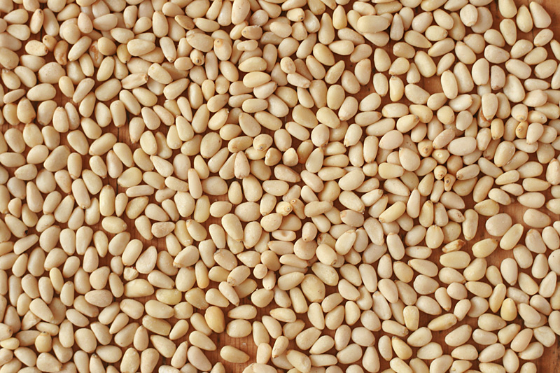 Czyli piniole lub orzeszki piniowe. Otrzymuje się je z szyszki śródziemnomorskiego gatunku sosny. Są maleńkie, bez siekania posypuje się nimi np. makaron, sałatki. Wchodzą w skład słynnego sosu pesto. Same w sobie mają delikatny smak. Zawierają niewiele białka. Dzięki kwasom tłuszczowym obniżają poziom cholesterolu. Są dobrym źródłem żelaza i magnezu. Stosuje się je do łagodzenia stanów zapalnych, pomagają na suchy kaszel. Szybko jełczeją, nie warto więc kupować ich na zapas, zwłaszcza że to najdroższe z bakalii (673 kcal/100 g).
