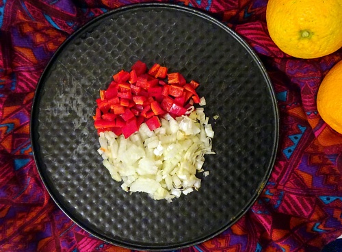 Cebulę i paprykę drobno pokroić. Zmiażdżyć lub posiekać czosnek.