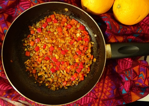 Na patelni z rozgrzaną oliwą z oliwek usmażyć cebulę i paprykę, dodać słodką i ostrą paprykę (w ilościach wg preferencji) oraz czosnek. Gdy warzywa się zeszklą, wlać pomidory z puszki, doprawić solą i pieprzem.