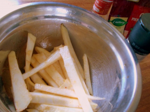 Wstawiamy do piekarnika na 200°Ci pieczemy przez ok. 30-40 min. W połowie pieczenia należy frytki przemieszać, aby były zarumienione z każdej strony.