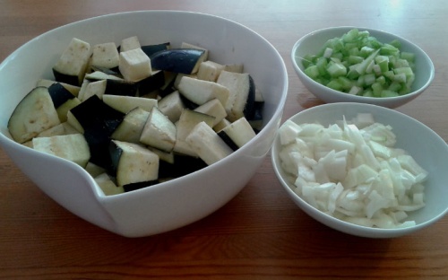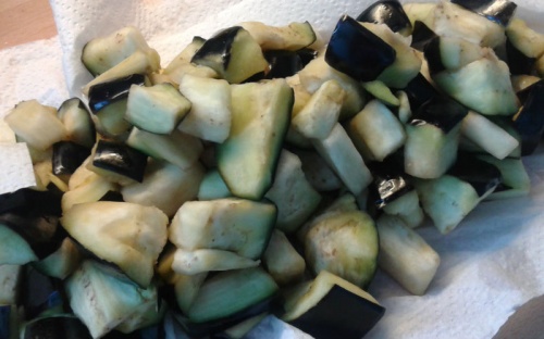 Zaczynamy od pokrojenia bakłażanów w kostkę i obfitego posypania ich solą. Miskę z bakłażanami nakrywamy czymś ciężkim i zapominamy o nich na godzinę. Przez ten czas bakłażany się "spocą", wypłynie z nich goryczka. A poza tym, gdy wyciśniemy z nich wodę, nie będą jak szalone piły oliwy podczas smażenia.