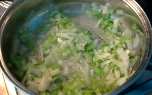 Cebulę i seler siekamy dość drobno. Wrzucamy na patelnię, podlewamy niewielką ilością wody. Gdy warzywa się podduszą, a woda wyparuje, dodajemy trochę oliwy i smażymy. Cebula i seler powinny się zeszklić. Potem do dodajemy przecier pomidorowy, pokrojone oliwki, opłukane kapary i dusimy na wolnym ogniu przez kwadrans.