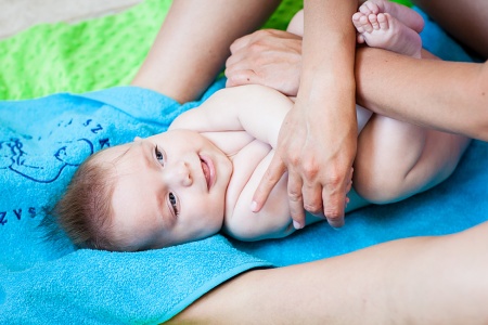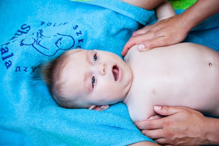 Kładziemy całą dłoń na brzuszku dziecka, poniżej łuku żebrowego i delikatnym ruchem z góry w dół, lekko uciskając, masujemy. Powtarzamy kilkakrotnie.