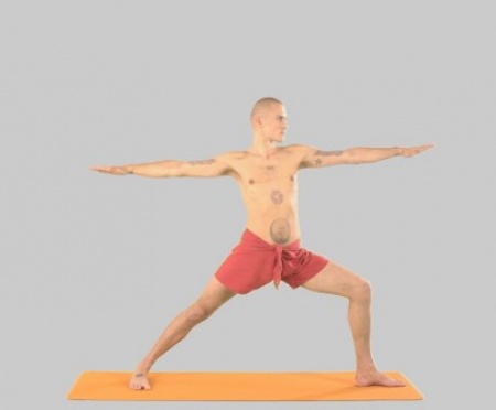 1. Stać w Tadasanie, zrób wdech i z wydechem przejście. Ustaw stopy na długość jednej nogi, połóż dłonie na biodrach - tak, że kciuki są na krzyżu, palce rąk na kolcach biodrowych.