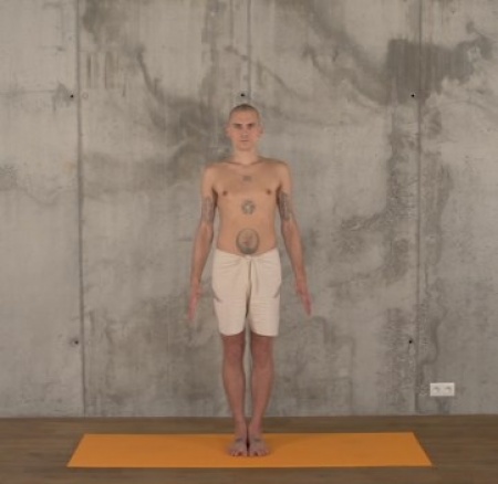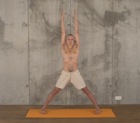 z wdechem podnieś się do góry,stopy do centrum - Utthita hasta padasana,