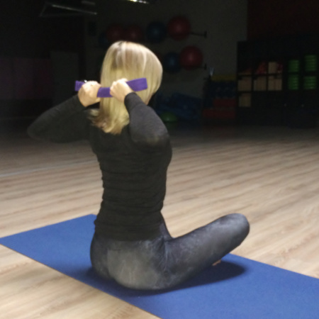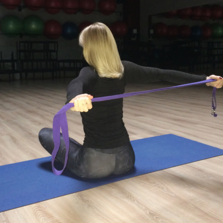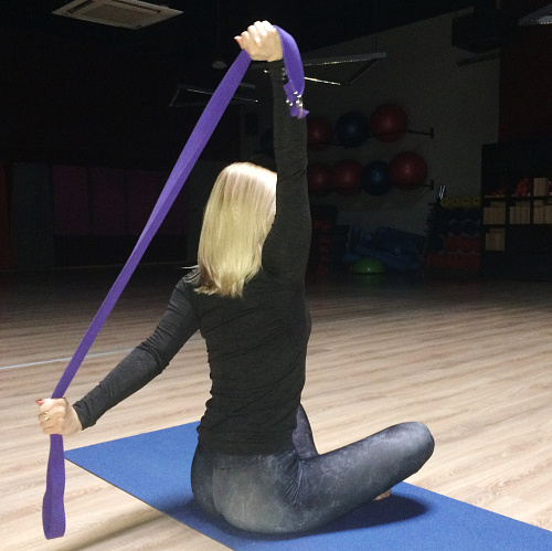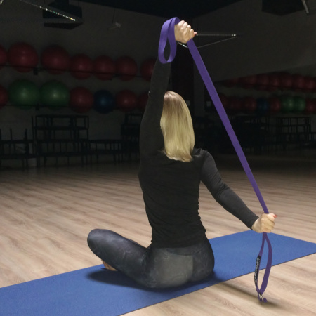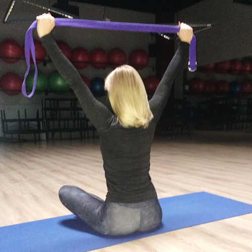 1. Chwyć pasek szeroko przed sobą utrzymując proste ręce i plecy oraz z łagodnym wdechem podnieś ręce nad głowę. Z wydechem przenieś ręce do tyłu, trzymając je cały czas wyprostowane. Powtórz ćwiczenie pięć razy.