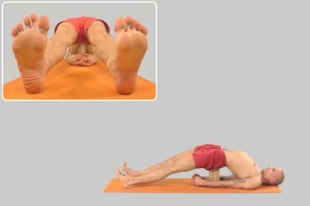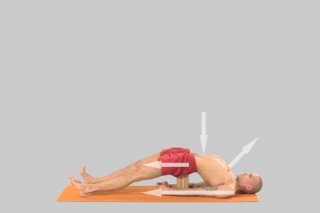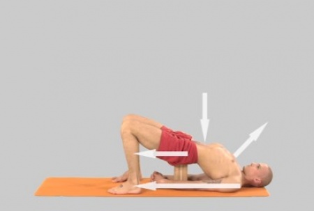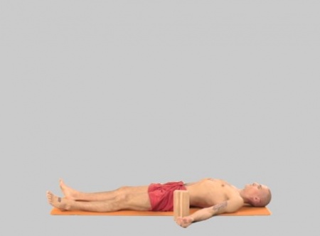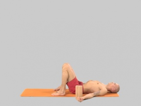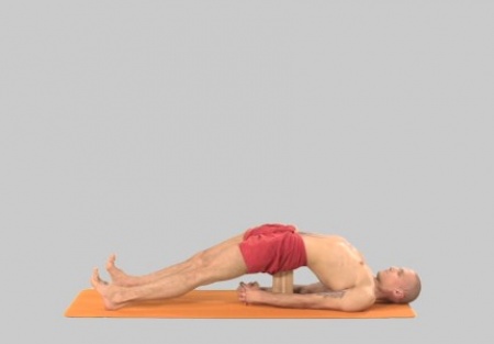 Nogi zgięte w kolanach, kość krzyżowa oparta na klocku, klatka piersiowa bardzo mocno otwarta, brzuch kompletnie rozluźniony.